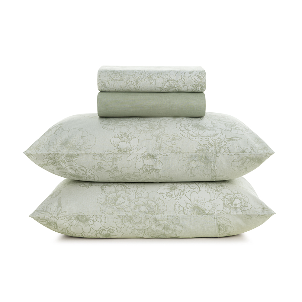 O jogo de cama Rebeca traz um conjunto floral filetado em tons de verde mais escuro com base verde claro, criando textura e profundidade com leveza e saindo do convencional para uma cama floral. O visual da cama Rebeca é fresco, equilibrado e tranquilo. O lençol com elástico tem listras regulares, mais grossas e mais finas, que harmonizam perfeitamente com as flores grandes e espaçadas do restante da cama. Com propriedades naturais do percal 100% algodão, o conforto é garantido para noites de sono restauradoras.