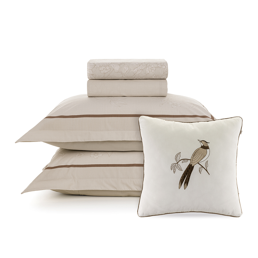 Com floral filetado em tom bege claro, o jogo de cama Mallu traz elegância natural e leveza à composição. As fronhas dimensionadas e a capa de almofada com bordado de pássaro complementam a proposta delicada. A cama Mallu traz tons de bege e marrom, que são tendência em casa e decoração. Apesar dos detalhes requintados, ela é neutra e deixa o ambiente equilibrado.